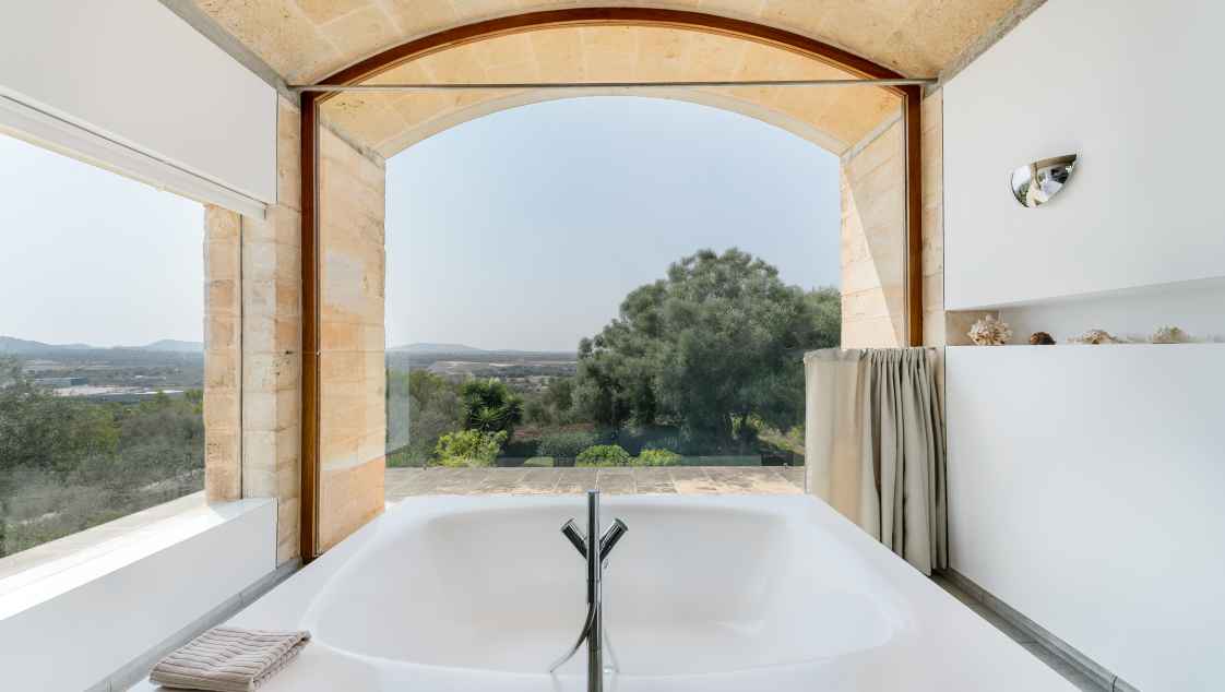 The exceptional rural villa "Sa Mola" near Felanitx impresses with its unique architecture and stunning sea views. Situated on a 16,000 m² estate, the rural villa accommodates up to 8 guests across 4 air-conditioned bedrooms with 3 bathrooms. The 20-meter pool with a shallow entrance and the spacious terraces provide the perfect setting for relaxing holidays. Modern design meets Mallorcan natural stone charm. Shops, restaurants, and beaches like Cala Mondragó and S’Amarador are only a short drive away.