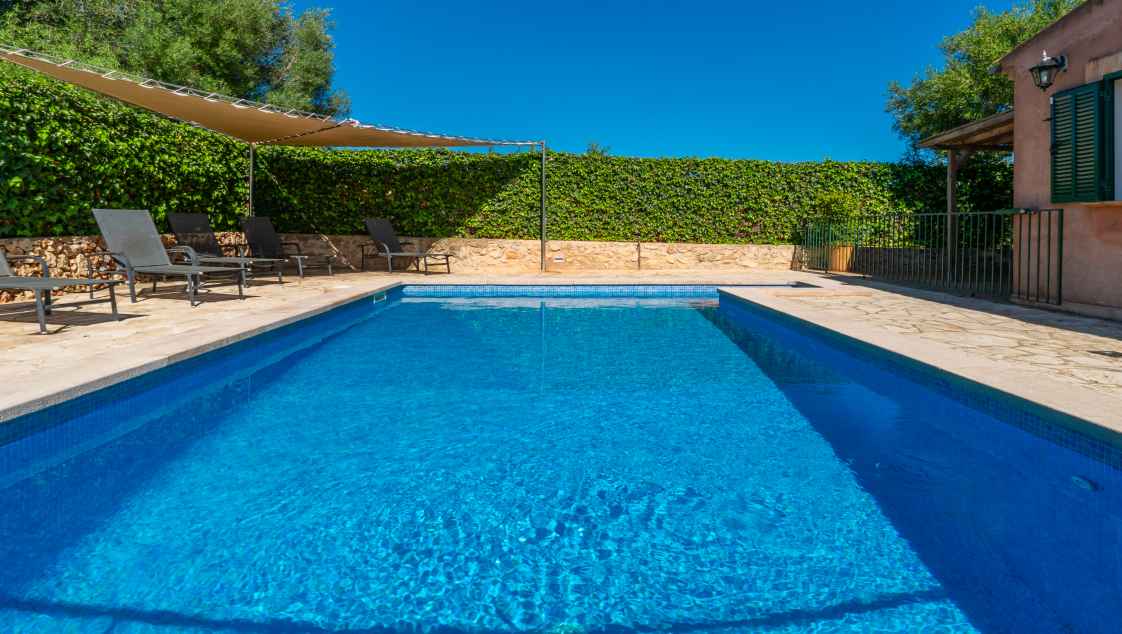 The family-friendly rural villa "Son Frau" near Manacor offers the perfect blend of countryside charm and modern amenities. Set on a generous 2400 m² plot, it features a beautifully maintained garden and a large pool with chlorine-free water and gently sloping entry. Three cozy double bedrooms and two modern bathrooms accommodate up to 6 guests. With air conditioning, fireplace, and jacuzzi, it’s perfect year-round. Spectacular beaches like Cala Varques are just a short drive away.